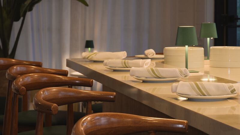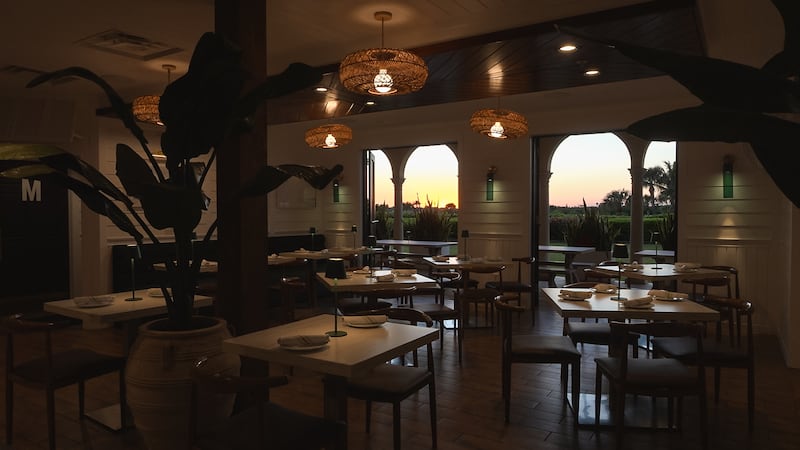 The interior feels coastal-chic, with gold accents and large green monstera leaves throughout. Walk to the back of the restaurant and you’ll find seating with a gorgeous view of the sunset over the intracoastal waterways.