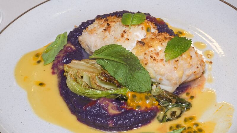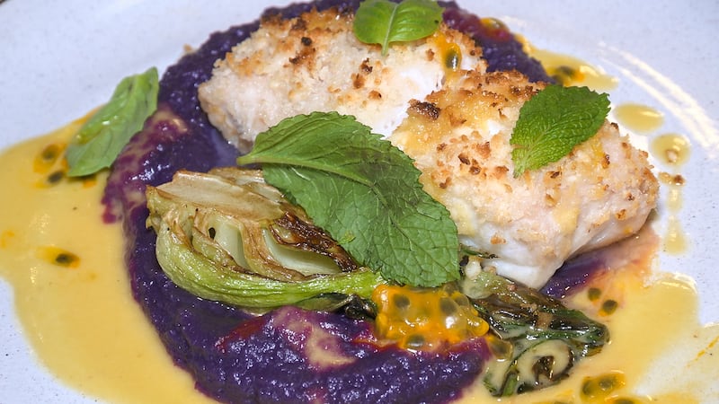 Macademia Grouper Macademia crusted grouper, hawaiian butter, on ube mash with bok choy. Sweet passionfruit glaze. (WFLX)